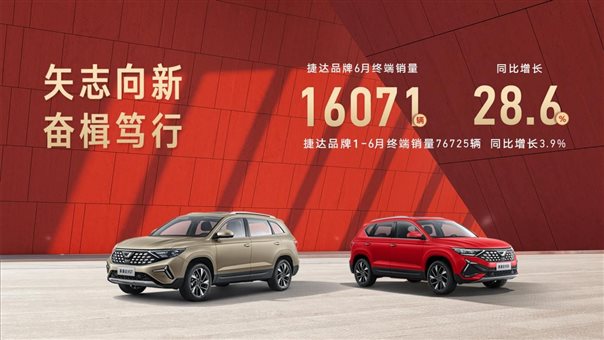 据6月销量显示,捷达品牌终端销量16071辆,同比增长28.6%;在艰难的上半年实现累计销量76654辆,同比增长3.8%。其中,1月销量突破2万,创历史销量纪录,取得开门红;2、3、4月份额持续攀升,进入覆盖市场前四;5-6月抓住多重利好叠加的车市“小阳春”契机,以“奋战六十天”的坚决行动力,实现了上半年逆势增长。
