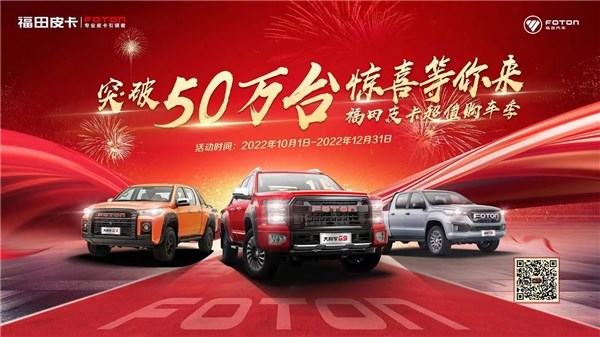 迎十一,庆国庆,为庆贺福田皮卡销量即将突破50万台,“福田皮卡超值购车季”火热开启!从10月1日起,大将军皮卡系列产品推出定车礼、金融礼、置换礼、增购礼、质享礼、互联礼及致敬礼七重大礼包,福田皮卡征服者系列产品推出定车礼、金融礼、置换礼、加油礼及无忧礼五重大礼包,价值百万的硬核“壕”礼回馈新老客户,多重福利叠加,超值超燃超礼遇!千万不能错过!