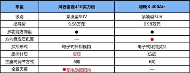 不难看出,在内饰上,风行雷霆410实力版的用料更足,带来了比哪吒X 400Air更强的高级感。