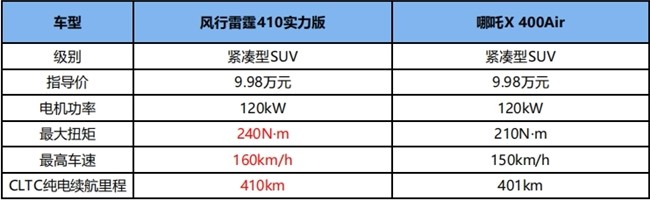 近几年,新能源汽车市场越来越卷,价格战一波未平一波又起。近日,特斯拉就宣布在全球范围内进行大降价,部分车型价格下调达1.4万元,这无疑又加重了市场的火药味!不得不说,在当下竞争十分激烈的新能源市场中,只有产品力强、性价比高的车型,才能赢得消费者青睐,而在10万级纯电SUV这个细分市场里,风行雷霆410实力版和哪吒X 400Air就是兼具实力和性价比的明星车型,那么,强强相遇,谁会更强呢?我们就来比一比,看谁更能打!