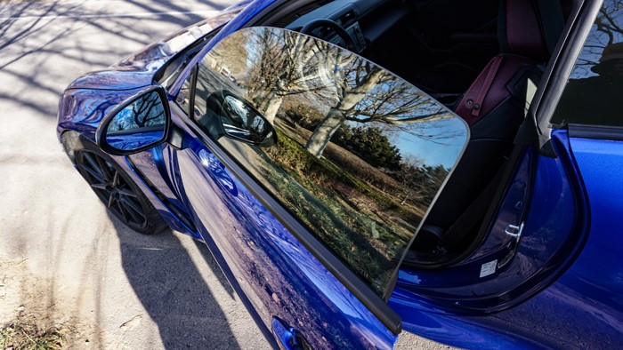 无框玻璃门是必不可少的设计元素,铝合金运动踏板让人很是喜欢。中控台这块多媒体屏幕很是有怀旧的感觉,斑斓的阳光洒在中控台上时,让人感觉回到了90年代,有种想去插磁带听歌的冲动……不过好在有CarPlay,完全胜任日常使用场景。