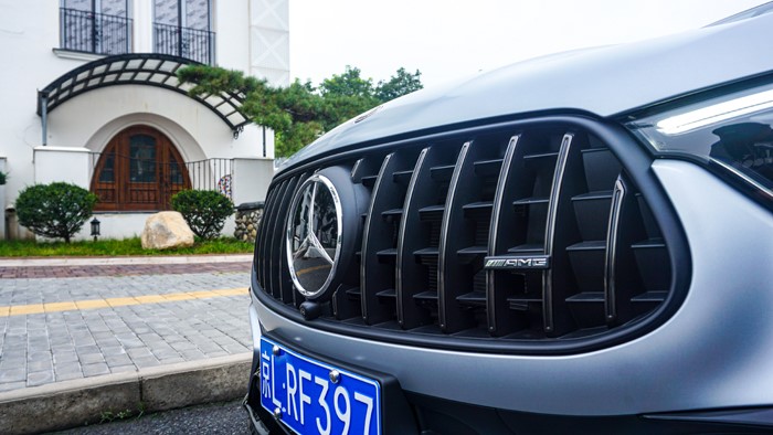前脸采用了AMG直瀑式进气格栅和熏黑的LED大灯组合,展现出强烈的力量感。引擎罩上镶嵌了AMG的徽章,很有辨识度。