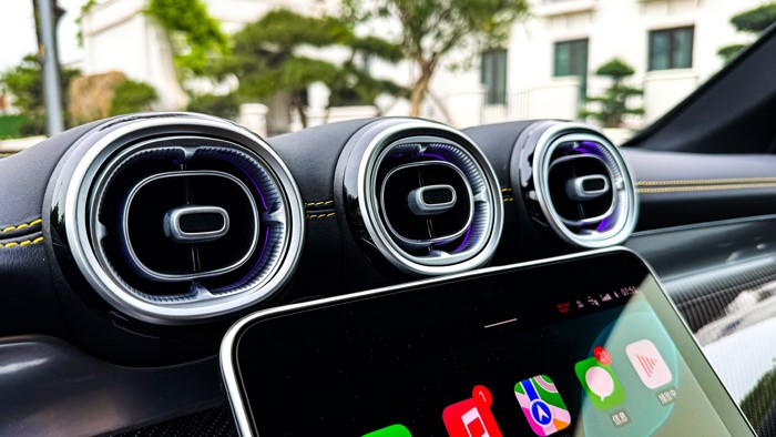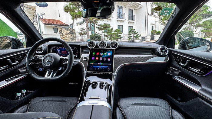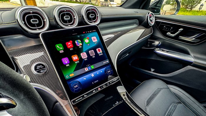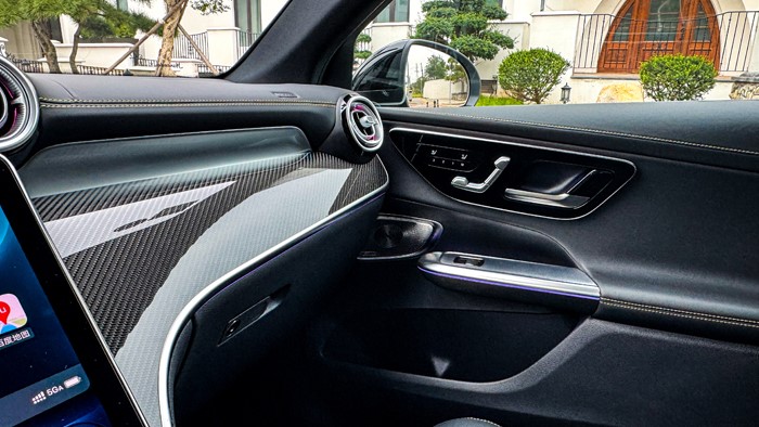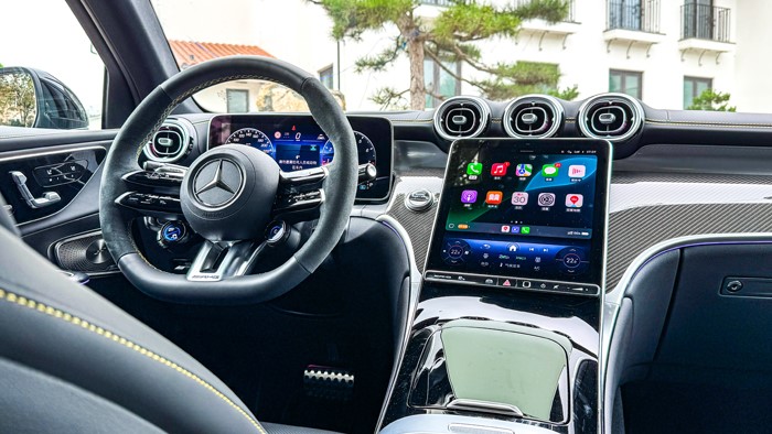 进入车内,奔驰2025款 AMG GLC 43 4MATIC的中控台采用黑黄配色,加上碳纤维材质的运用让视觉上感觉非常战斗,细节方面的处理也显示出大厂的功底。
