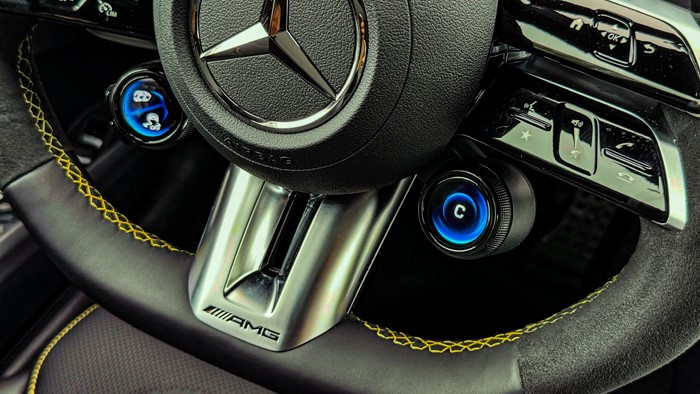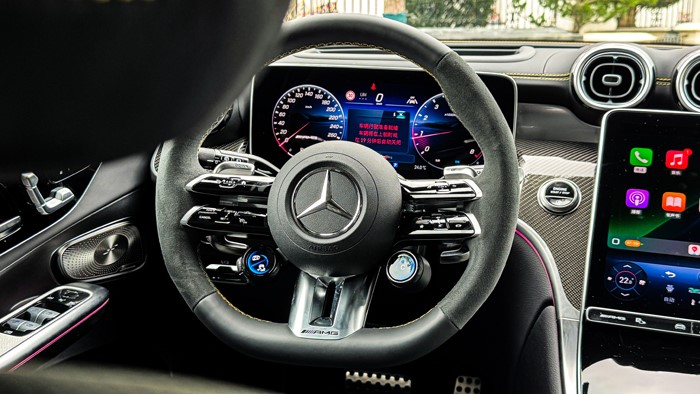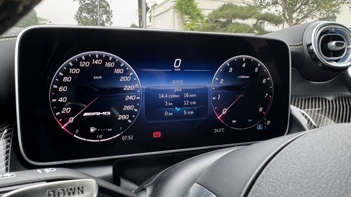 12.3英寸的仪表盘采用全液晶显示屏,显示清晰,操作简便。AMG方向盘选用麂皮与真皮相拼的款式,黄色砸线非常凸显运动感,握感也很舒适。方向盘上的快速切换单元方便驾驶者随时转成:战斗模式。