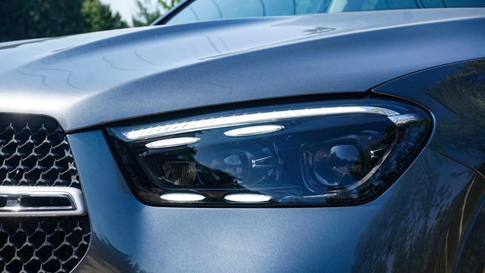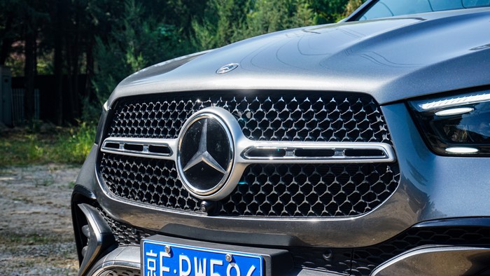 点阵式星辉中网格栅尺寸非常大,整体感觉显得豪华、凌厉。配合很有层次的下包围,车头ACC自适应巡航雷达藏在中网正中的奔驰LOGO内部,这个车标也不简单,带有环境加热丝防止低温环境下结冰,维持工作温度。