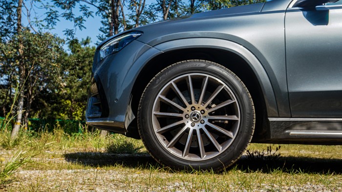 车辆使用了21寸的多条辐轮毂,轮胎为前后鸳鸯胎,静肃性佳抓地表现也不错。前轮胎规格均为275/45 R21,后轮胎为315/40 R21。