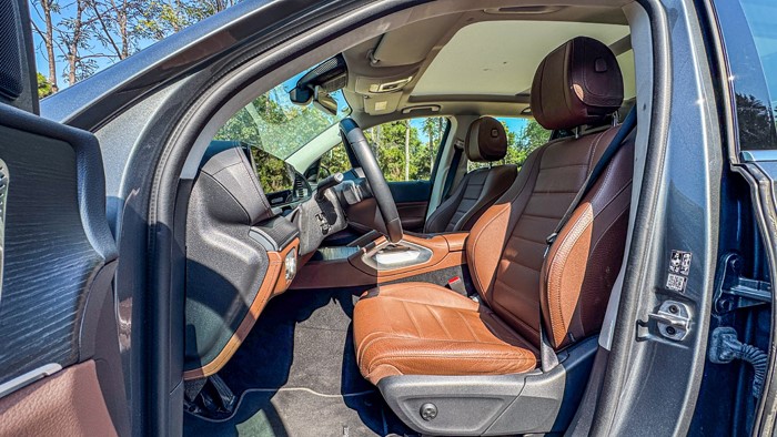 奔驰GLE450 4MATIC的座舱空间相对来说还是很宽敞的,宽大的运动座椅由高级真皮包覆,粗壮的侧向支撑很有视觉冲击力,座椅的舒适度性极好带有电加热功能。