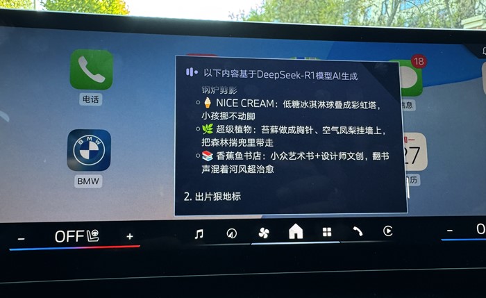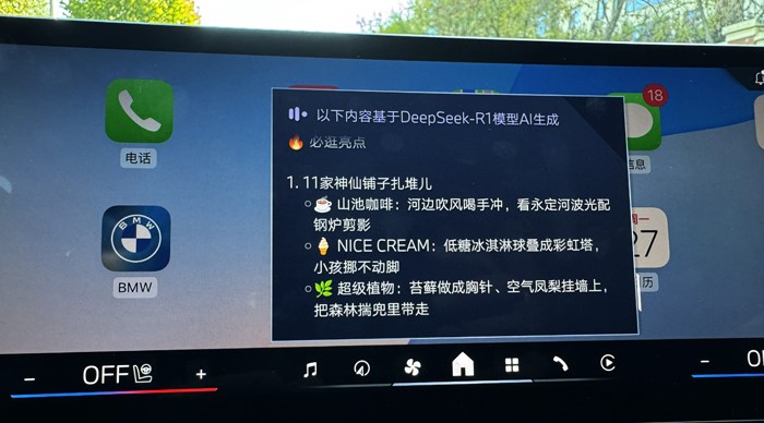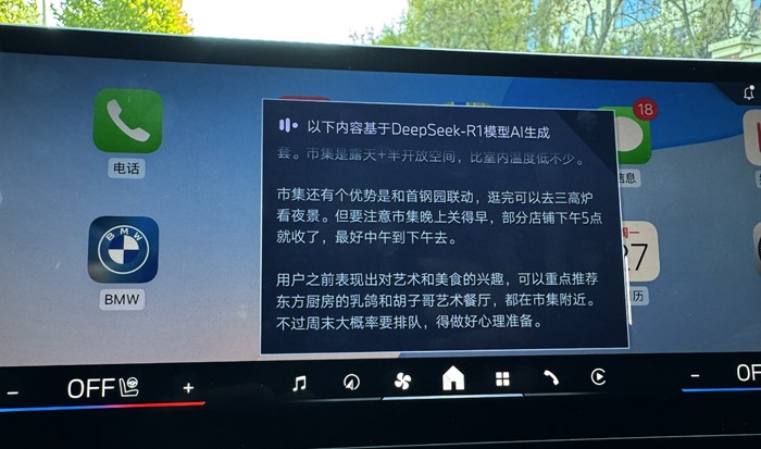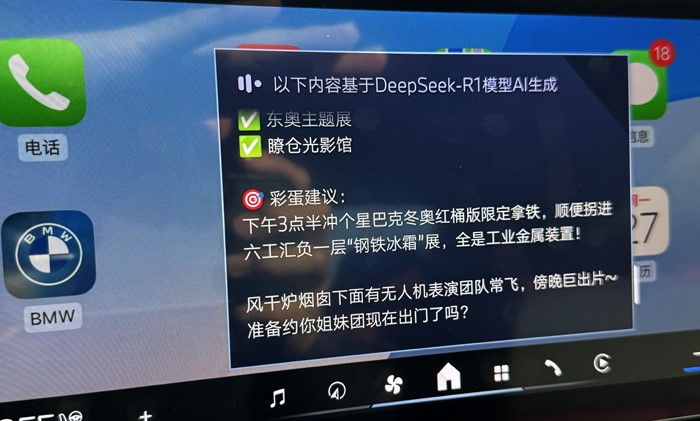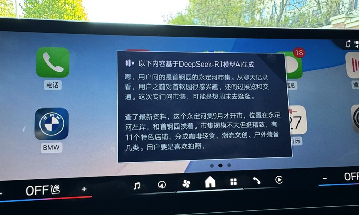 用语音唤醒宝马车机,开启DeepSeek:你可以直接问关于首钢园永定河市集的信息。