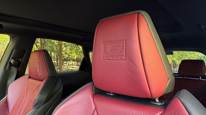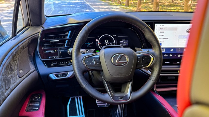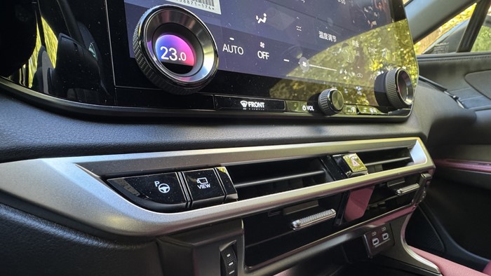 真皮包裹的方向盘手感极佳,皮质相当细腻,并带有F SPORT徽章。多功能按键的分布也是清晰明了,触手可及。
