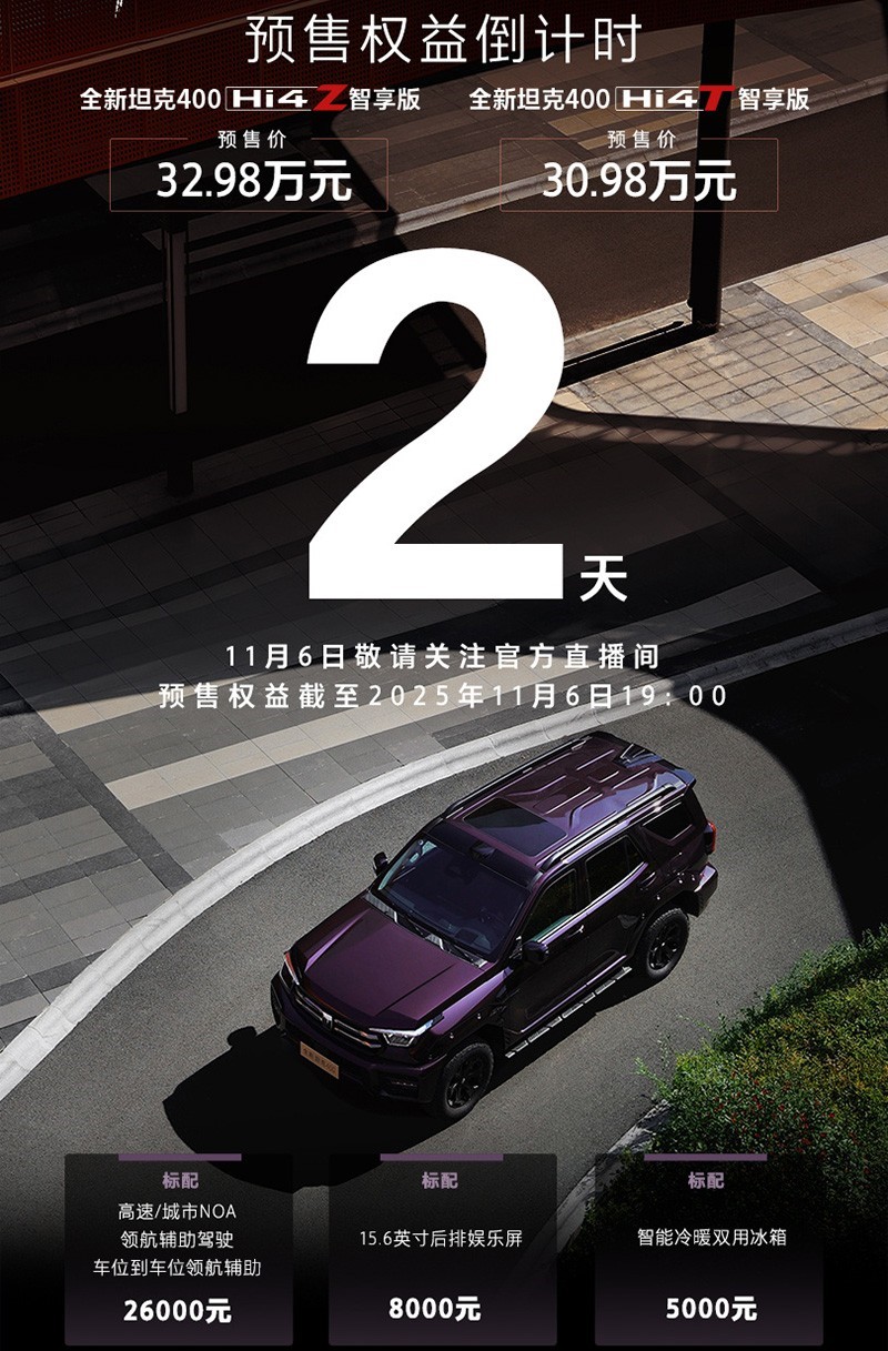 官方公布,新款坦克400将11月6日上市。新车已经开始预售,预售价30.98-32.98万。