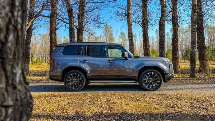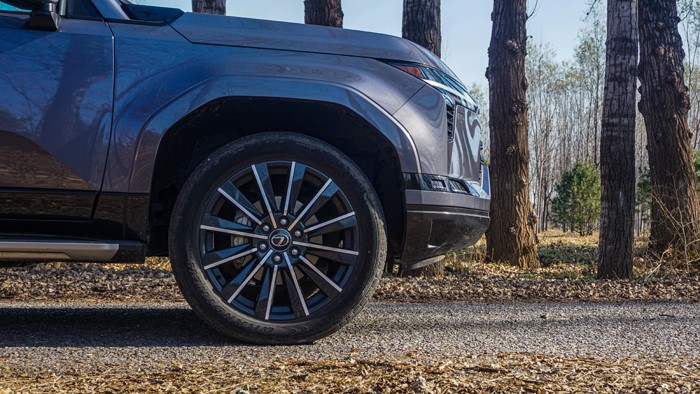 GX550h凌峰版使用了22寸轮毂,轮胎规格为265/50 R22,品牌为邓禄普,作为一台硬派越野车实属不小。大尺寸的车轮增加了整体的视觉冲击力,同时也提升了车辆的运动感和豪华感。为了上车方便,脚踏板也是原厂配置。