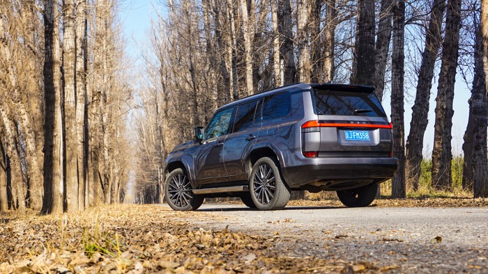 车身侧面轮廓线条简洁利落,展现出SUV的稳重感和力量感。车窗下沿做了阶梯式设计,方便驾驶员越野时观察路况。车身尺寸为4960×1980×1935mm,轴距达到了2850mm。