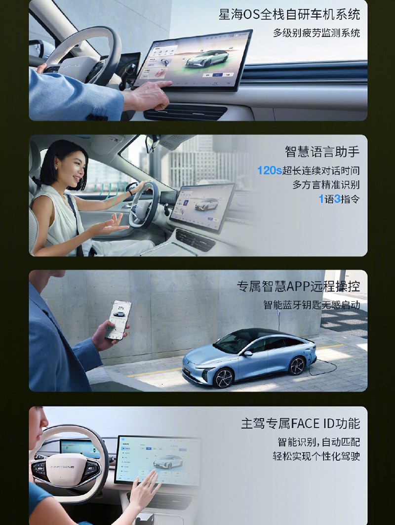内饰方面,新车全系标配升级15.6英寸中控屏搭配8.8英寸液晶仪表,顶配车型升级64色氛围灯。新车还提供智能语音交互。其中800V超快充版还配备前排座椅电动调节、加热、通风功能。