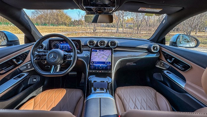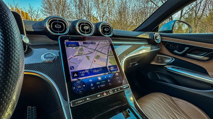 这套内饰设计截至目前为止已使S级、C级、E级等车型获得了史无前例的豪华氛围,在这台CLE 300 4MATIC 豪华型身上也是如此。那优雅的环抱式中控曲线,以及质感满满的碳纤维饰板、金属部件,让CLE的车厢获得了如豪华游艇般的观感。12.3英寸的屏幕依然非常的漂亮,显示效果细腻,黑色NAPPA真皮包裹的新款双翼式电容方向盘握感很舒适,样式也很招人喜欢。