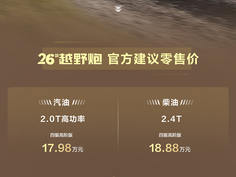 近日,2026款长城越野炮上市,共推出2款车型,售价区间为17.98-18.88万。