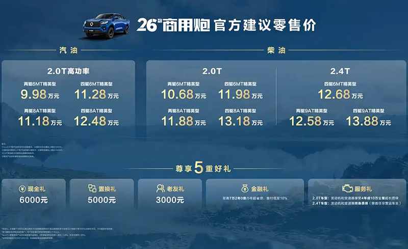 近日,2026款长城商用炮正式上市,共推出11款车型,售价区间为9.98-13.88万。