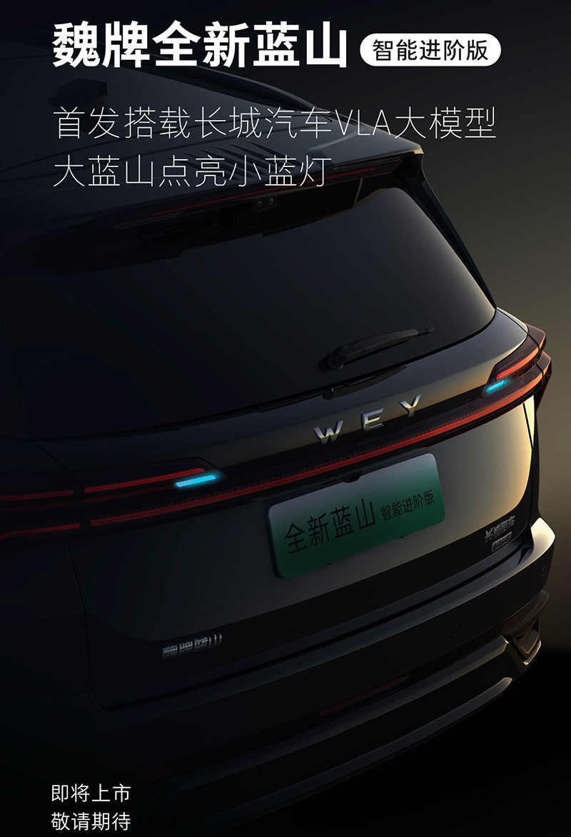 魏牌全新蓝山智能进阶版即将上市,首次搭载长城汽车 VLA 大模型,智能能力全面进阶。新车预计延续现款外观,配备激光雷达、隐藏式门把手与贯穿式尾灯。