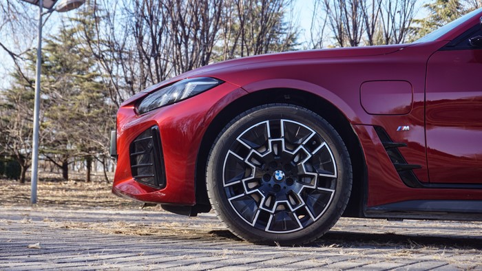 车辆侧面左前翼子板处增加了充电接口,同时,宝马i4标配的是18英寸半封闭式轮毂,本车选配了19寸,前轮胎规格245/45 R19,后轮胎规格255/45 R19。