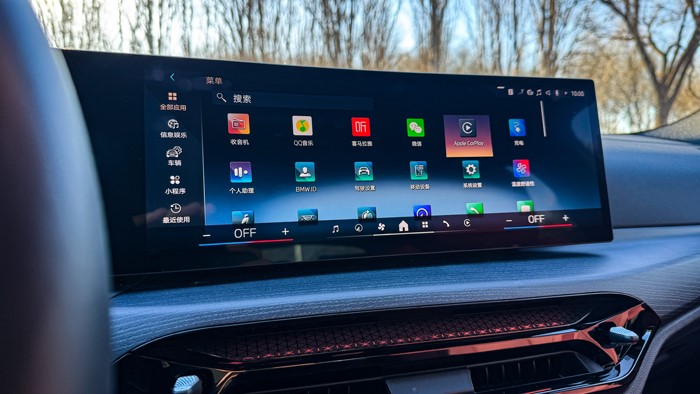 14.9英寸、12.3英寸的双联屏组合让车内的科技感很足,属于电车的那份电味儿设计也很浓郁。iDrive车机系统除了流畅度非常高之外,附带的功能APP也非常多。