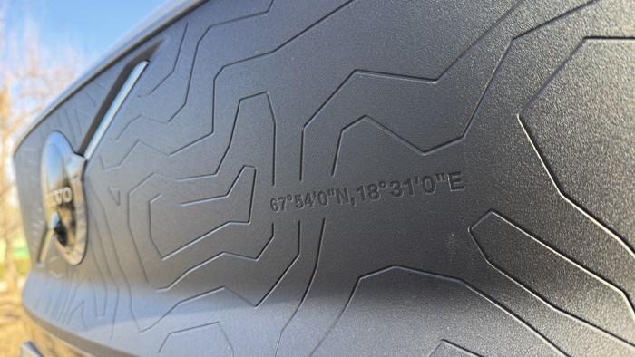 维京之斧头灯造型锐利,采用LED光源,提供出色的照明效果,由于是纯电车型,前格栅为全封闭式设计。巨大的沃尔沃黑色标徽格外抢眼,瑞典的凯布纳山脉与阿比斯库山脉的地形图纹饰是前脸的最大特征,当然还有这个凯布纳山脉的经纬度坐标。