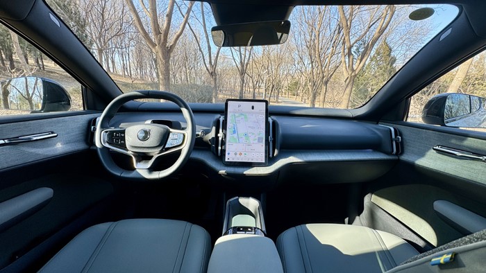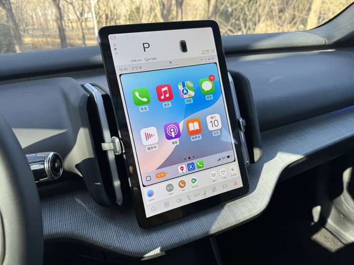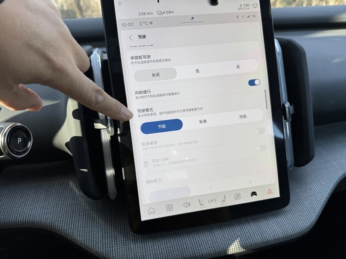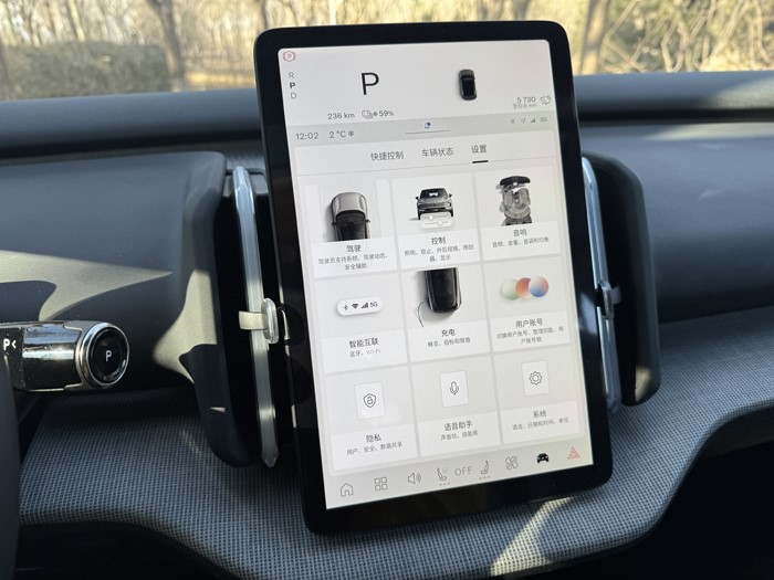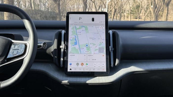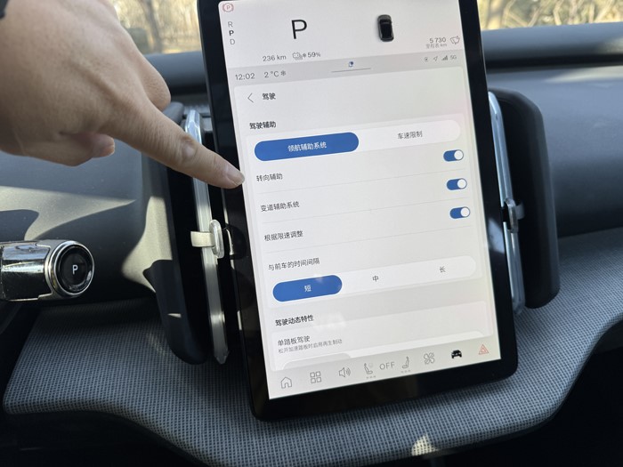 车辆时速、挡位、电能等显示均在中央液晶屏最上方来显示。车辆的科技配置丰富,配备了导航、行车记录、L2级Pilot Assist驾驶辅助、B站、音乐软件等等,车机芯片为高通骁龙8155操作顺畅。