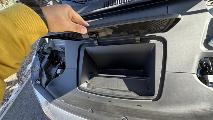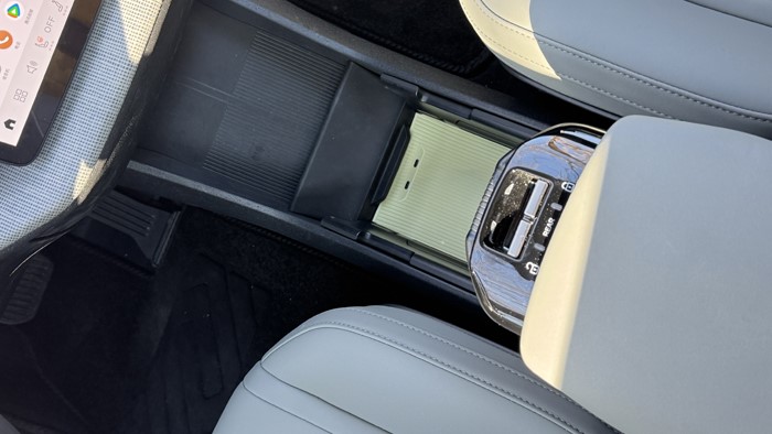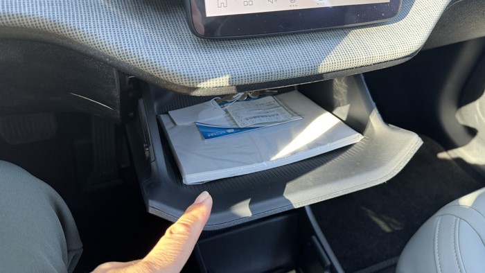 亮点设计:手套箱并不在副驾乘客座椅前方,而是位于12.3英寸触摸屏的正下方,并只能通过液晶屏来打开,这同样创造了副驾驶前方更多腿部空间。
