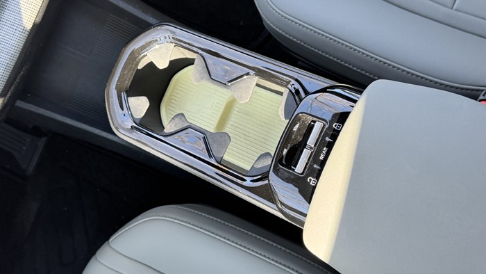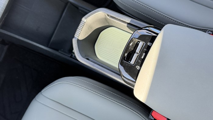 还有一个亮点设计:中央扶手带有抽屉式伸缩储物格,可进行2挡调节长短,储物、放置水杯可自行调节。中央通道底部还做了无线手机充电和储藏仓设计,在平时不用的时候可以遮住杂物。全车仅有2个玻璃升降开关,不过可通过中间的REAR键切换控制后排车窗升降。