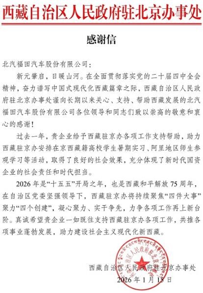 近日,西藏自治区人民政府驻北京办事处向北汽福田汽车股份有限公司发来感谢信,对其长期支持西藏经济社会发展、助力驻京办工作表示衷心感谢。这封来自雪域高原的认可,不仅是对北汽福田在藏具体工作的肯定,更是对其作为国有骨干企业,坚定不移服务国家战略、赋能区域协调发展和践行社会责任的生动体现。