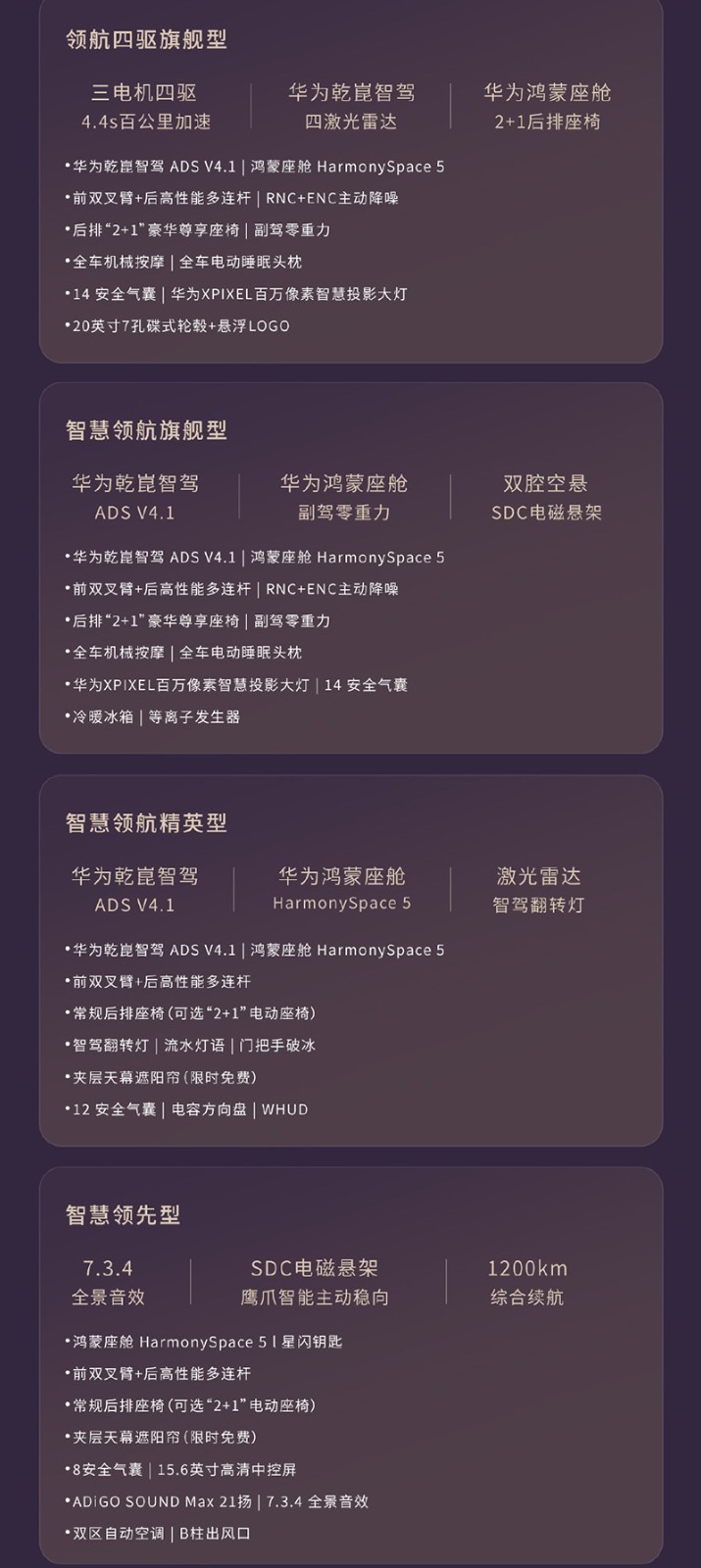 内饰方面,新车采用15.6英寸中控屏搭配12.3英寸仪表,并提供27英寸W-HUD。新车将搭载HUAWEI ADS 4辅助驾驶和鸿蒙座舱HarmonySpace 5。