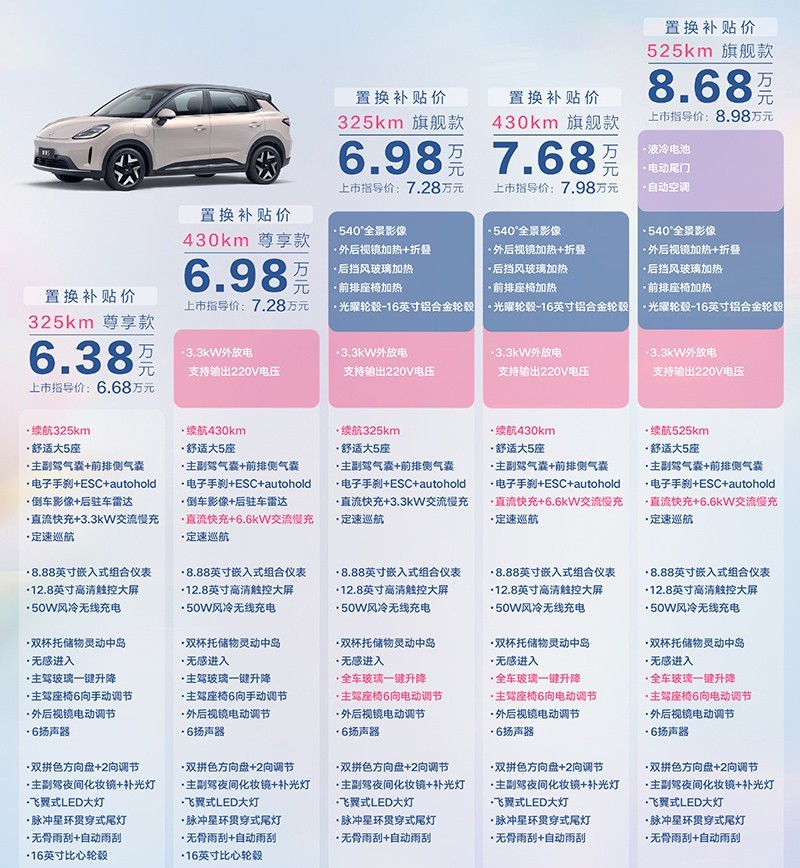 动力方面,新车搭载的电机最大功率为75kW,峰值扭矩180N·m。CLTC续航提升至525km。