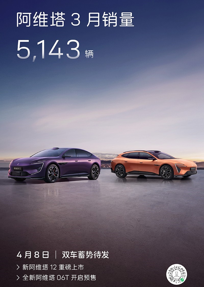 近日,阿维塔公布3月销量,销量为5143辆,并公布阿维塔06T将4月8日开启预售。新车定位全新中型轿车。