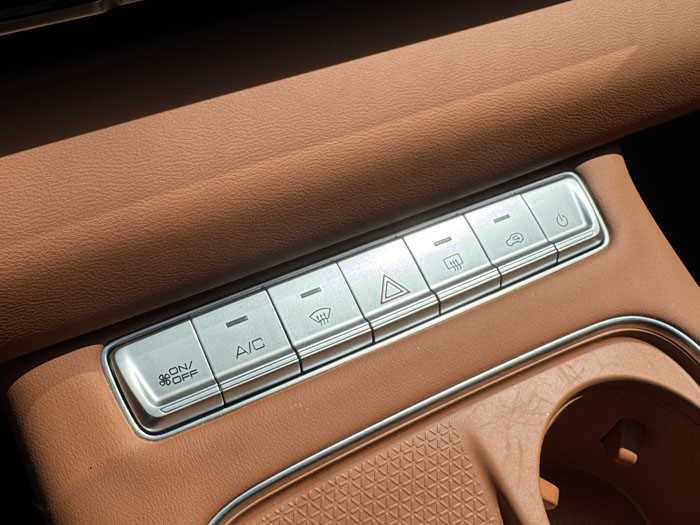 中控扶手箱部位,设置有手机无线充电面板和两个杯托,最前端则保留了空调、双闪警示灯等实体按键。